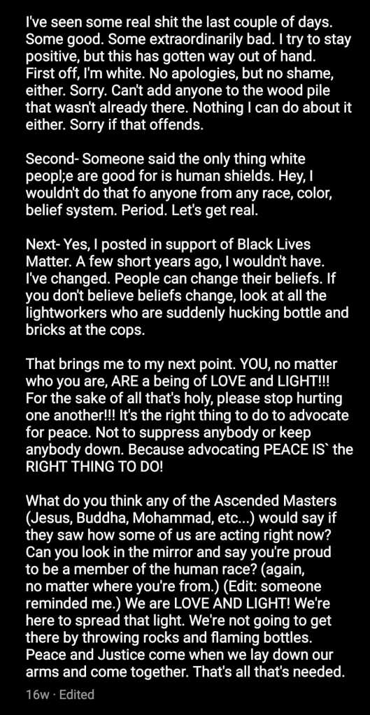 The detractor’s logic goes as follows- by saying “All lives matter” I must mean every serial killer, rapist, child molester, human trafficker, mass murderer, Nazi and Satanic cannibal’s life matters, too. And that makes me no better than they are. This person even went so far to accuse me of “f*cking little kids” among other things. This individual even went on to insult my spirituality, call me stupid, say I knew nothing of science… I don’t remember what all else because I was too busy deleting his/her bullshit to read it all.