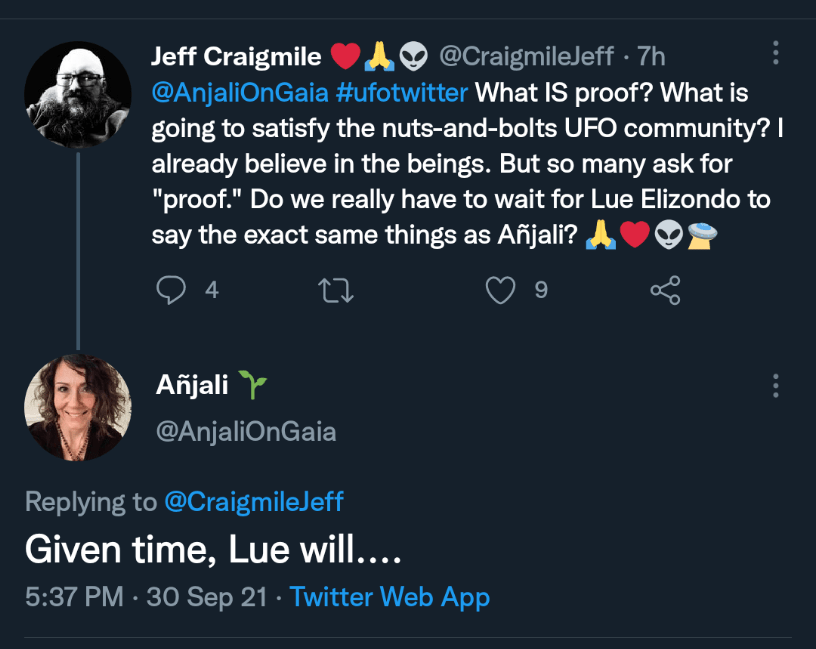 I know I’m squarely in the corner of both the beings and Añjali. I really admire and appreciate what they’re doing. I really want this to be successful with all my heart. I intend to help any way I can. I understand Añjali has asked us to be kind to one another and even the skeptics and nay-sayers. But, I can’t sit on the sidelines and watch such a gentle being getting ripped to shreds by certain UFO Twitfologists who I won’t even name here.
