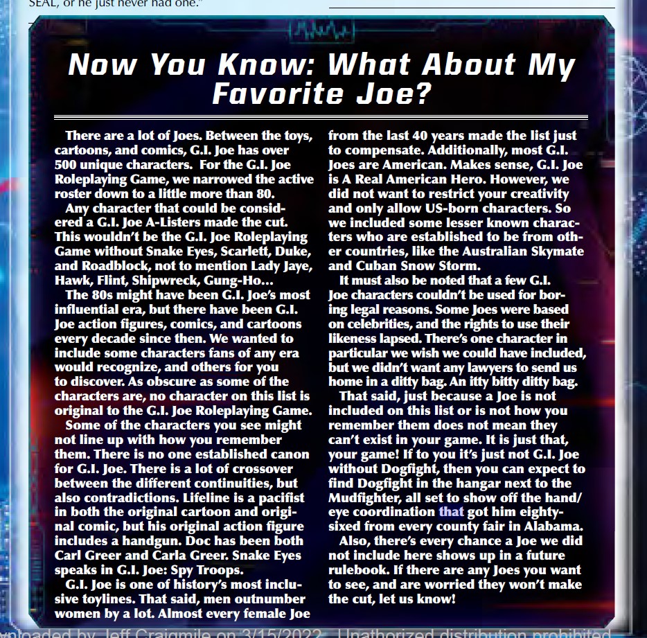 I grew up playing with GI Joe toys among other things. I remember pretty much all of the characters listed in the book and wondered about several they haven’t mentioned. I think the sourcebooks for this game have the potential to be loaded with awesomeness.