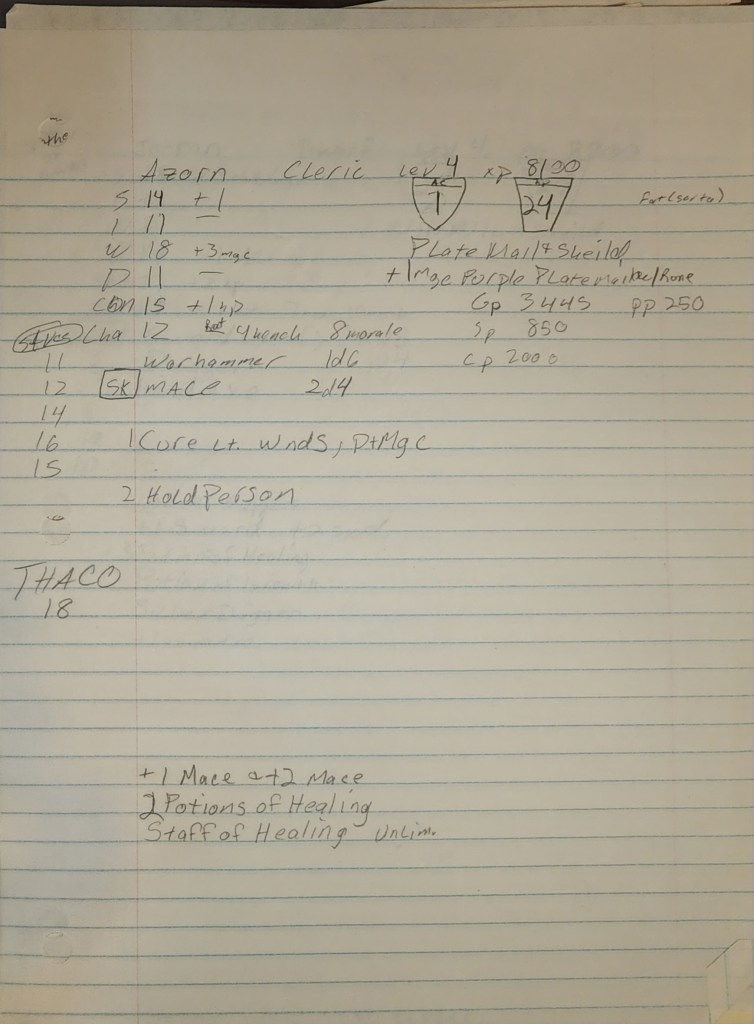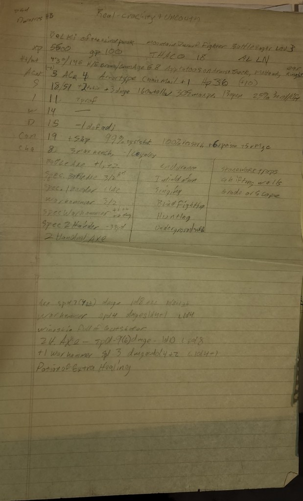 I discovered a ton of my old characters when I was cleaning house recently. I was so thrilled. I still even have all of my 11×17 legal pads with my 2nd Ed AD&D characters. I made so many characters back then. I still fondly remember those days with love and joy.