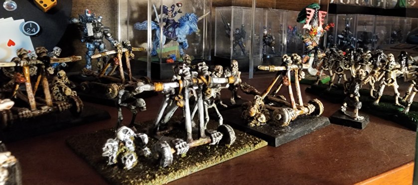 Not only are the Undead fun to play in that game, but they’re incredibly fun to paint, too. Not to mention skeletons are pretty easy. I also like 40K Necrons for the old Tub Thumpin rules. (I get knocked down, but I get up again…) Being in command of an undead army in any game is a rush, especially about the time you get to start raising more army.