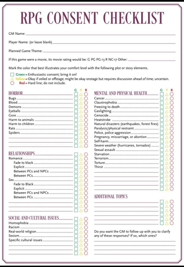 Content Warning: This article may include a lot of potentially trauma-related subjects. The image of the RPG Consent Checklist contains concepts that could be triggering for some. Please proceed with caution.