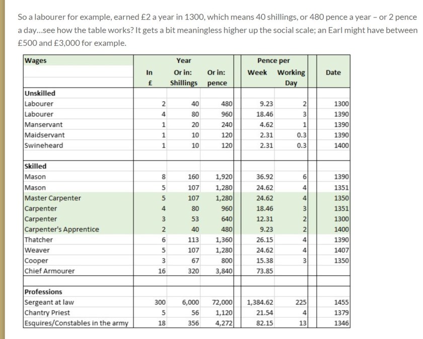 I estimate blacksmiths and other cottage artisans were mostly paid by selling goods, which is why they are not listed above. I’m certain a fair amount of barter also occurred prior to 1600 AD in the real world much as it would likely happen in most fantasy RPGs. How much are cows, chickens, trades, favors and other items worth? Can you really put a price on friendship and goodwill?