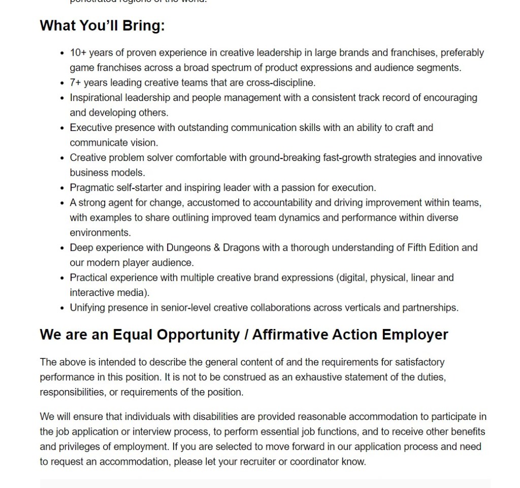 The thing I find most incredulous about this whole list of requirements is that they want qualifications that none of the original founders of T$R could have possibly possessed. It almost sounds like they want a PhD in Business and 10+ years in charge of a Fortune 500 company and oh, have you maybe heard of Dungeons & Dragons 5E. (*Notice not a word about prior editions.)