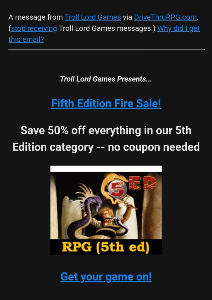 Congratulations, WotC. You win. Companies are dumping 5E products at a discount just to get rid of them. They know that if OGL 1.1 invalidates the prior OGL that their product will be worth less than the paper it’s printed on.
