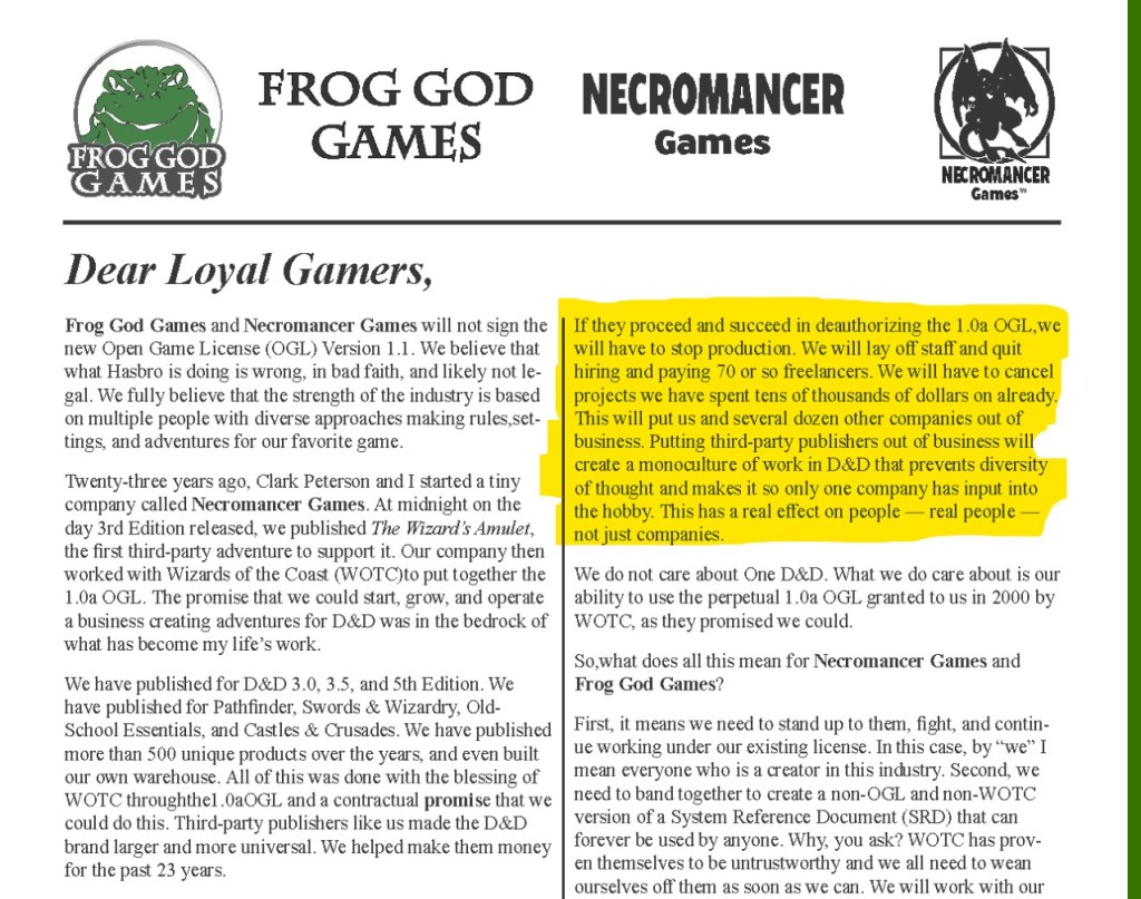 These aren’t just pretty words on a screen or a piece of paper. These are people’s lives we’re talking about. These aren’t just individuals- there are entire families affected by this OGL 1.1 document! How do you sit in your corner office at WotC HQ and not realize this stuff?