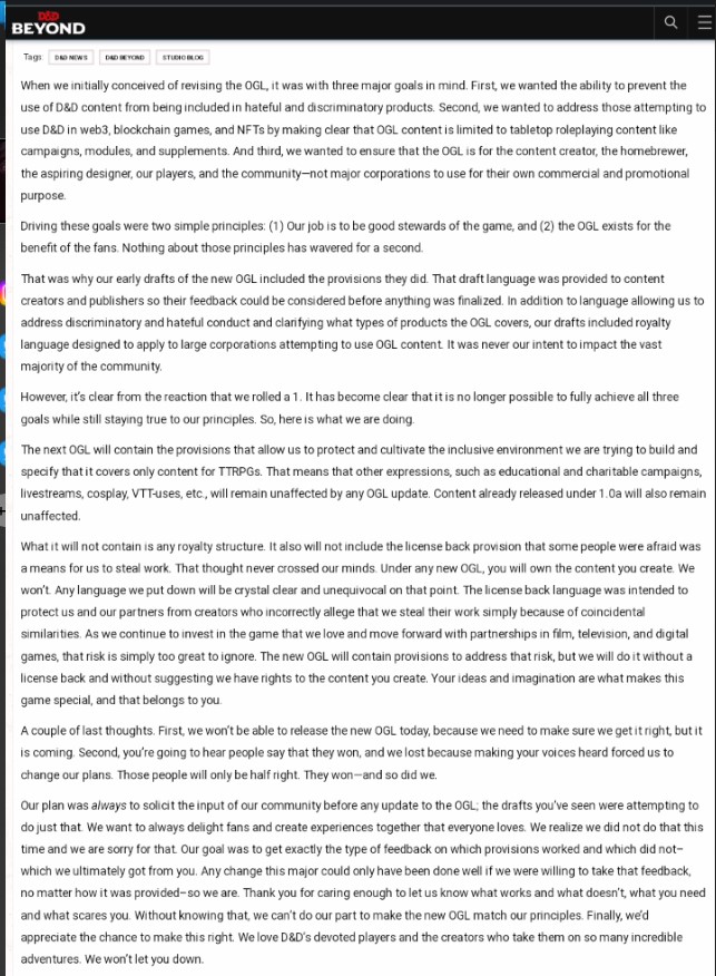 After being hounded on Twitter, Facebook, by phone calls, and emails over the course of eight days, WotC issued a statement on what used to be the popular D&D Beyond website. DDB was a strange choice for this release given hundreds, maybe thousands of fans recently canceled their subscriptions following news of the OGL 1.1 leak. Well known D&D spokesperson Ginny Di loudly canceled her subscription to the TTRPG mega site in protest of the new OGL’s treatment of third party content creators.