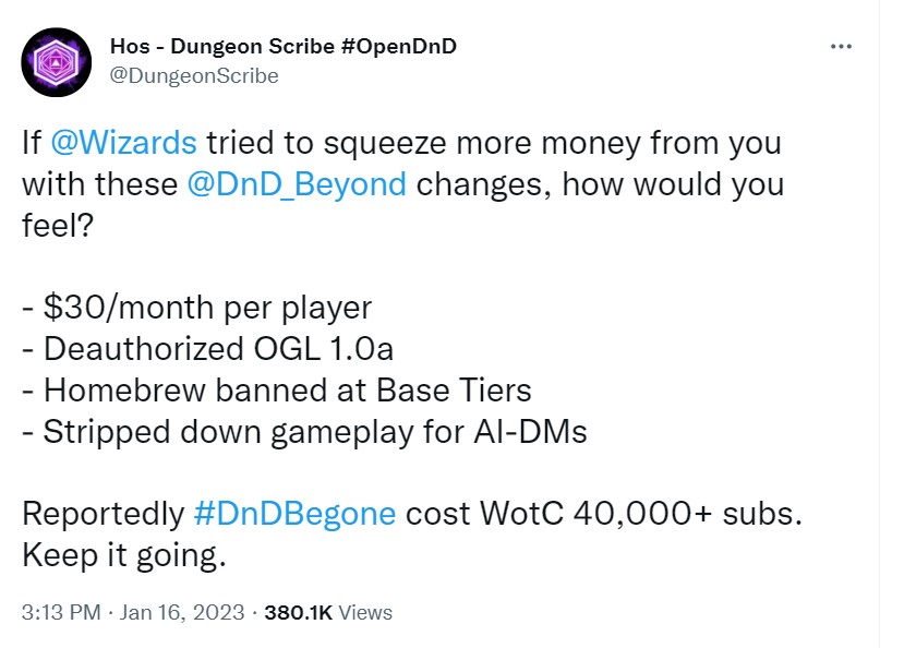 WotC/Hasbro, we began #StopTheSub and #DnDBeGone to the tune of 40,000+ cancelled subscriptions last I checked, and you still won’t listen.