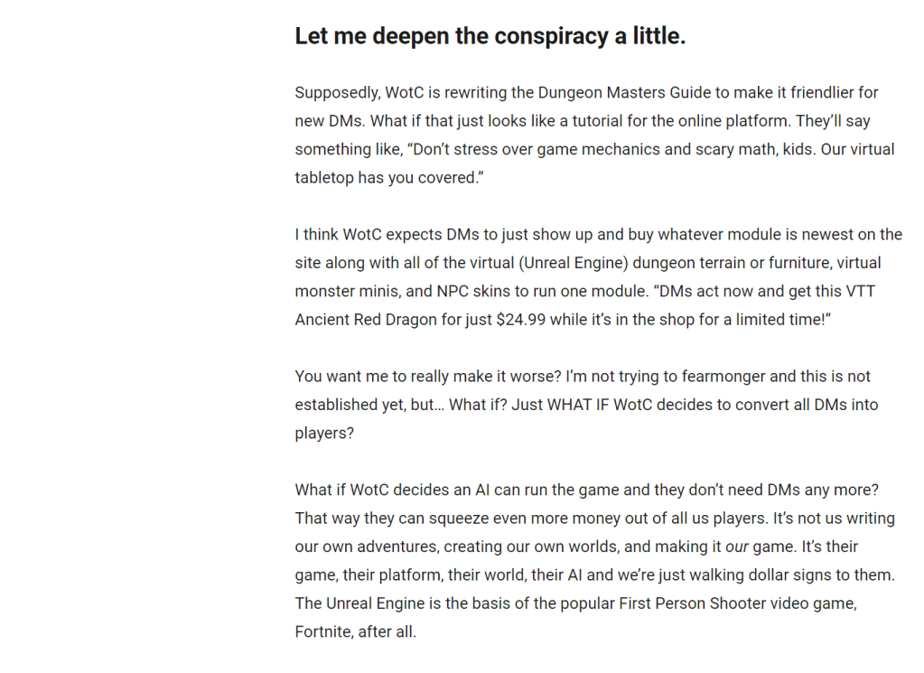 So WotC/Hasbro’s evil scheme is to totally monopolize the TTRPG market by destroying the OGL and eliminating those pesky Dungeon Masters. No more homebrew, no more problems. Right?