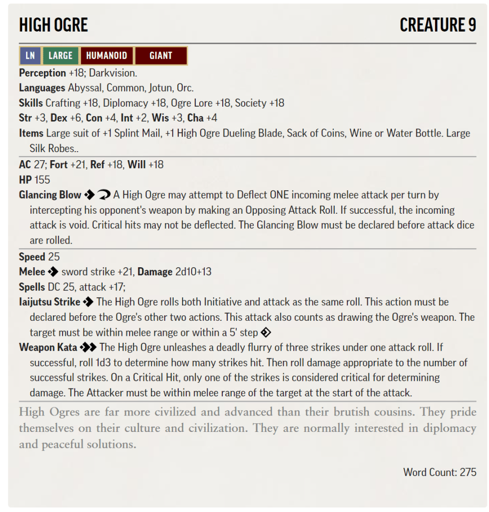 For this monster creation session, I went with the High Ogre. It’s an Ancestry of Ogres that evolved down a different path from their more brutish cousins. They are building an advancing civilization akin to humans or dwarves.