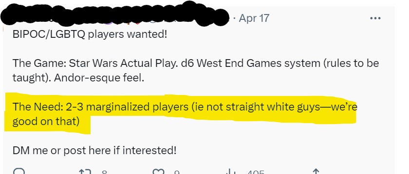 I’ve seen plenty of ads for games on Twitter and elsewhere that read similarly to the Star Wars group invite above. Heck, I recently saw one that said BIPOC LGBTQIA+ ONLY. I’m not wanting into a D&D actual play group that clearly doesn’t want people with my particular appearance. That’s okay. I’m totally cool with it.