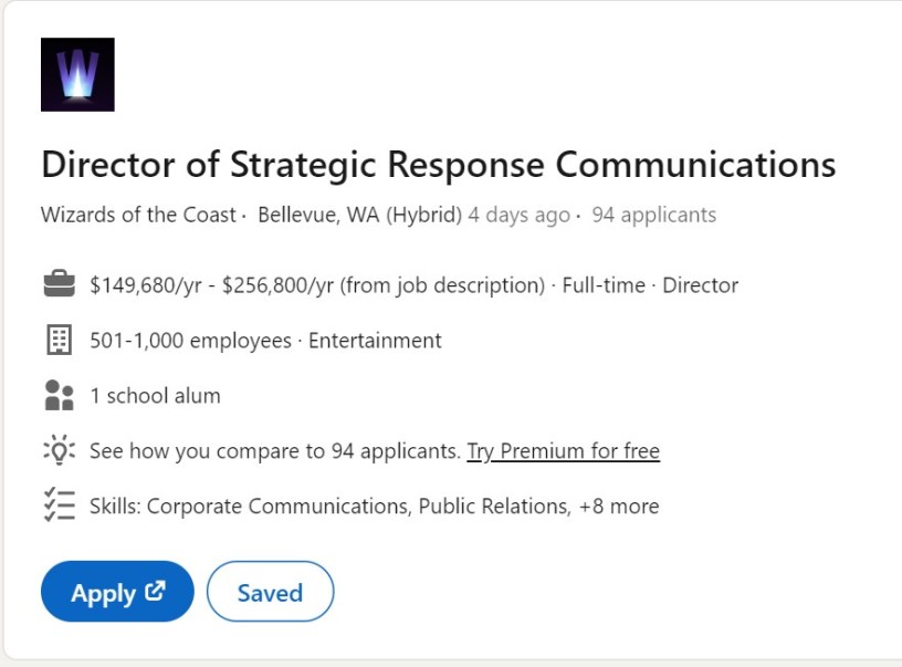 Common sense should dictate half of the decisions required by this job. It can’t be half as hard as whoever wrote this job ad makes it sound. Look at WotC’s track record lately. Seriously? I think anyone could have handled the Pinkerton disaster better.