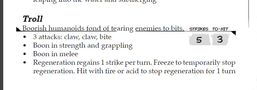 I could add one line in the description to give the Troll another head or have it breathe fire. Everything I love about making monsters quick and easy in other games is right here. I’m very impressed by this plan.