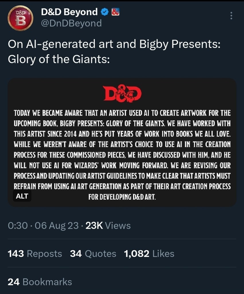 Okay, let’s be real here- The editors that work for WotC, probably some of the best paid, most experienced editors in the TTRPG business. They work for the largest company in the TTRPG business. How in the actual heck did someone not think, “Oh, it’s 2023. Maybe we should check to see if anyone is using AI art.”