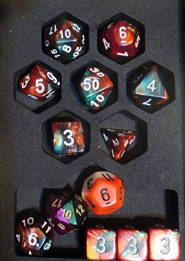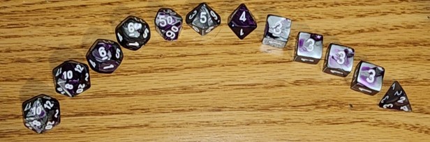 That’s hard to say. I have so many dice and if I’m not absolutely in love with the colors, I don’t buy the set. My favorite type of die is a d12. My favorite style of dice set these days consists of 2d20, 2d12, 1d00, 1d10, 1d8, 4d6, and 1d4. My favorite colors are hematite metallic with red, Red/black swirl with gold ink, and a couple of the sets pictured.