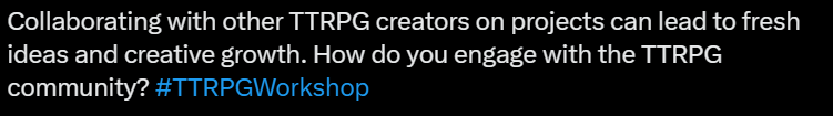 Hey, if someone out there wants to collaborate with me, we can talk. If we actually click maybe we could put something together. TTRPG collaboration is like any other relationship. It doesn’t have to be a lifelong commitment, but it does have to work well enough to get the job done. My poor wife will be the first one to tell you I’m terrible with relationships.