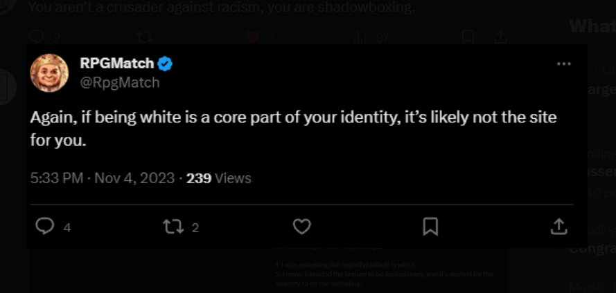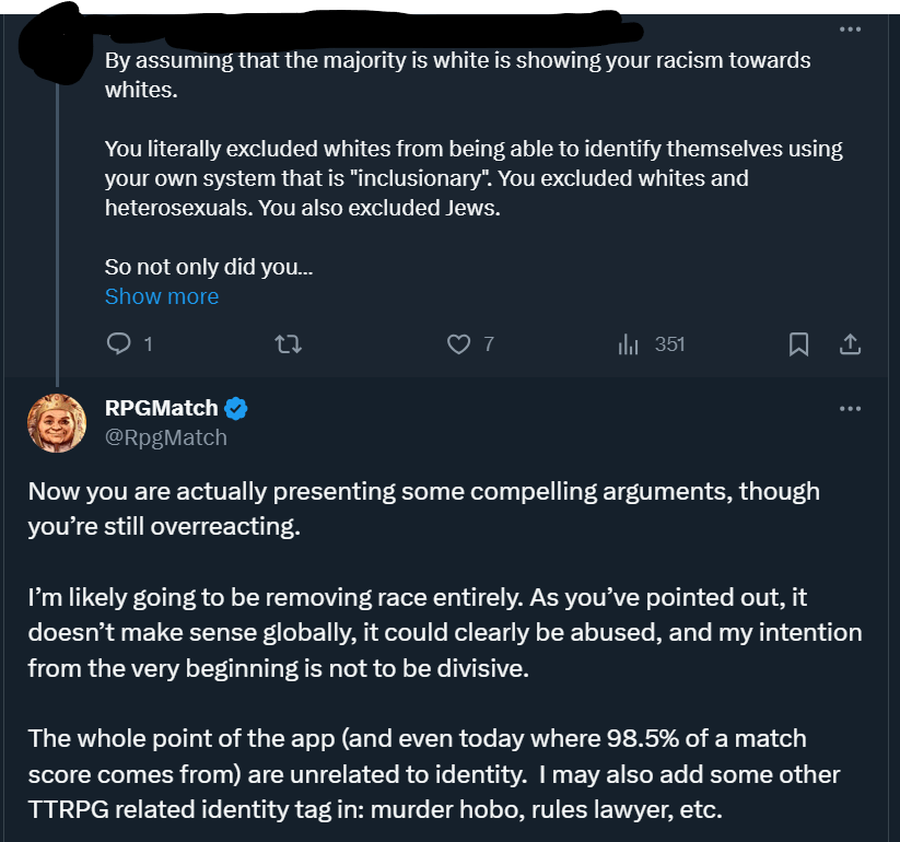 Not about race, obviously. That’s quite serious and not all that surprising. RPGMatch has been exemplary in dealing with the whole thing along with most of the people on the X (Twitter) thread. If nothing else, we’ve been civil with one another for the most part.