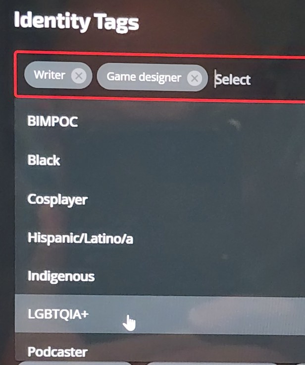 I made a profile on this site a few months ago and I wasn’t offended by the inclusion of Identity tags. Player, GM, Actor, Cosplayer, Voice Actor, etc seem like perfectly reasonably TTRPG related tags to me. BIMPOC, Hispanic/Latino/a, Indigenous, and LGBTQIA raised a bunch of flags in the #ttrpgcommunity for whatever reason. I’m not upset in the slightest about those tags being on the site, in fact I’d encourage it.