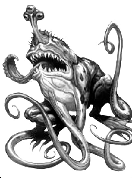 A hideous abomination with powerful hind legs, its front legs replaced with four long black tentacles and two yellowed misshapen eyestalks rises from the muck and slime before you. It towers over both man and elf alike. It opens its void like maw as the mud and slime drip off of it as it lets out a bellowing croak. What do you do?