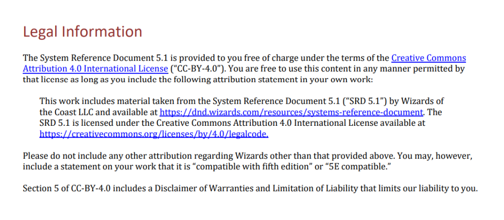 In my targeted rage against Wizards of the Coast, I quoted the wrong Creative Commons License. The correct License is CC-BY-4.0. Thanks Pteryx on Mastodon for pointing out my error. I’ll watch for things like this more closely going forward.