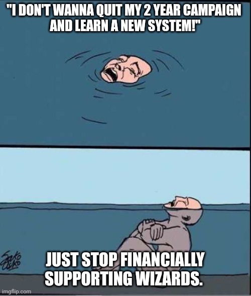 Don’t be a blind shill for Wizards of the Coast! Use some discernment. Realize WotC is a big, slimy, greedy, uncaring corporate machine who just happens to be in charge of Dungeons & Dragons. I know it’s hard to believe, but there are a TON of other games out there besides D&D– many of them would welcome your enthusiasm and support.