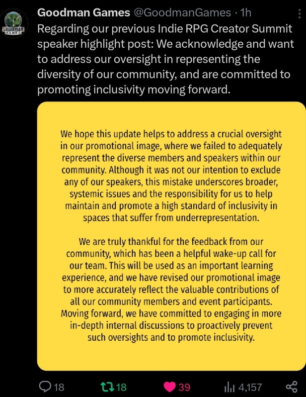 Goodman Games and BackerKit had a great idea to benefit the TTRPG community in 2024. It went from great idea to near-failure at the speed of X (Twitter.) The ad clearly shows the names and faces of ten Caucasian men. Yes, many of them look like me to some extent.
