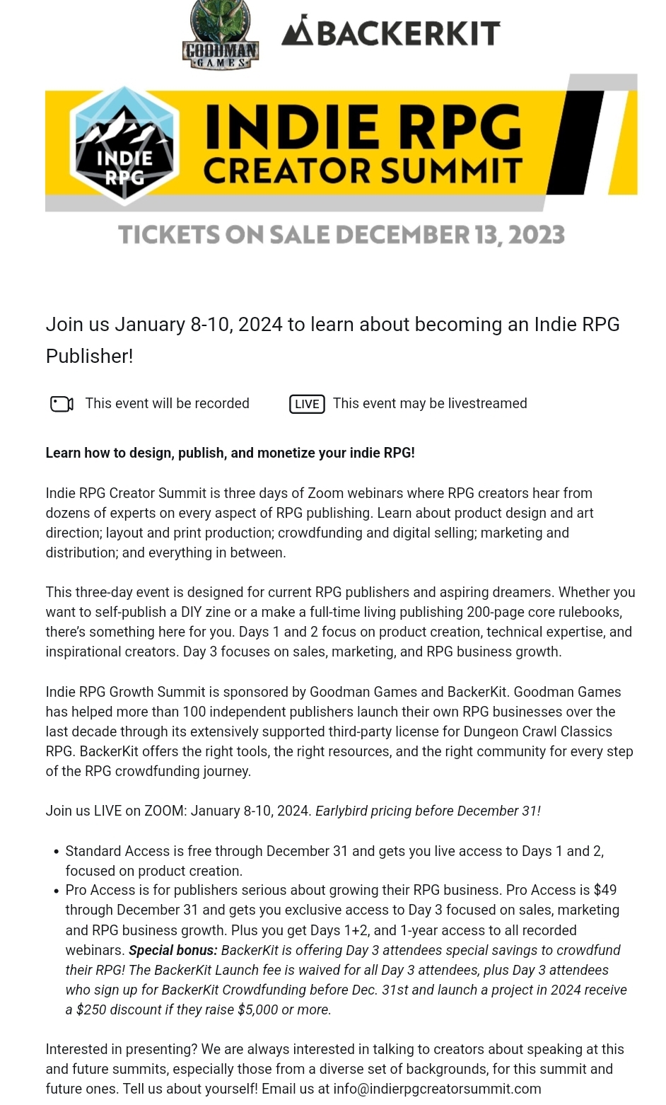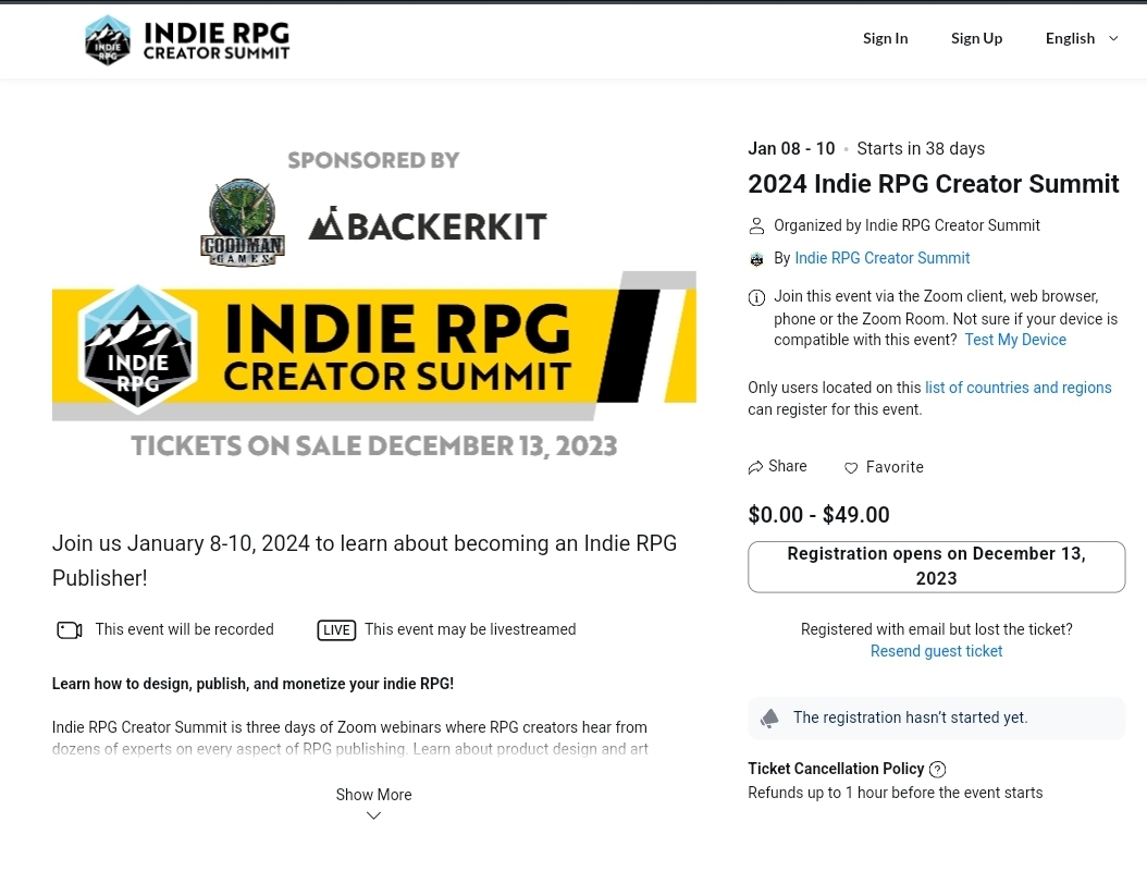 Goodman Games and BackerKit along with all of the well-intentioned panelists who wanted to put together an Indie RPG Creator Summit are getting their lunches eaten by people who were never going to the summit in the first place. I even went so far as to say they might think about canceling the event entirely. Tickets go on sale December 13th. The event is January 8-10, 2024. The last day is only available if you pay the $49 ticket price in advance. Days one and two are FREE.
