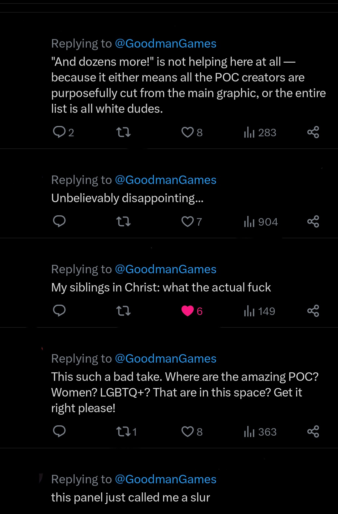 Then I scrolled down a bit and started reading the comments (See Gallery of Comments.) I am absolutely appalled at how fast the comments devolved into accusations of bigotry and racism. Worse comments (that I’m not going to show) were on the Goodman Games apology. The real hardcore bigoted 🦆🦆🦆holes showed themselves and dozens more!