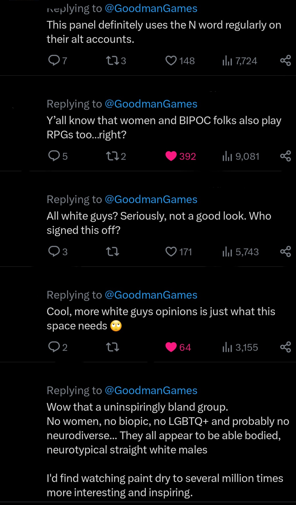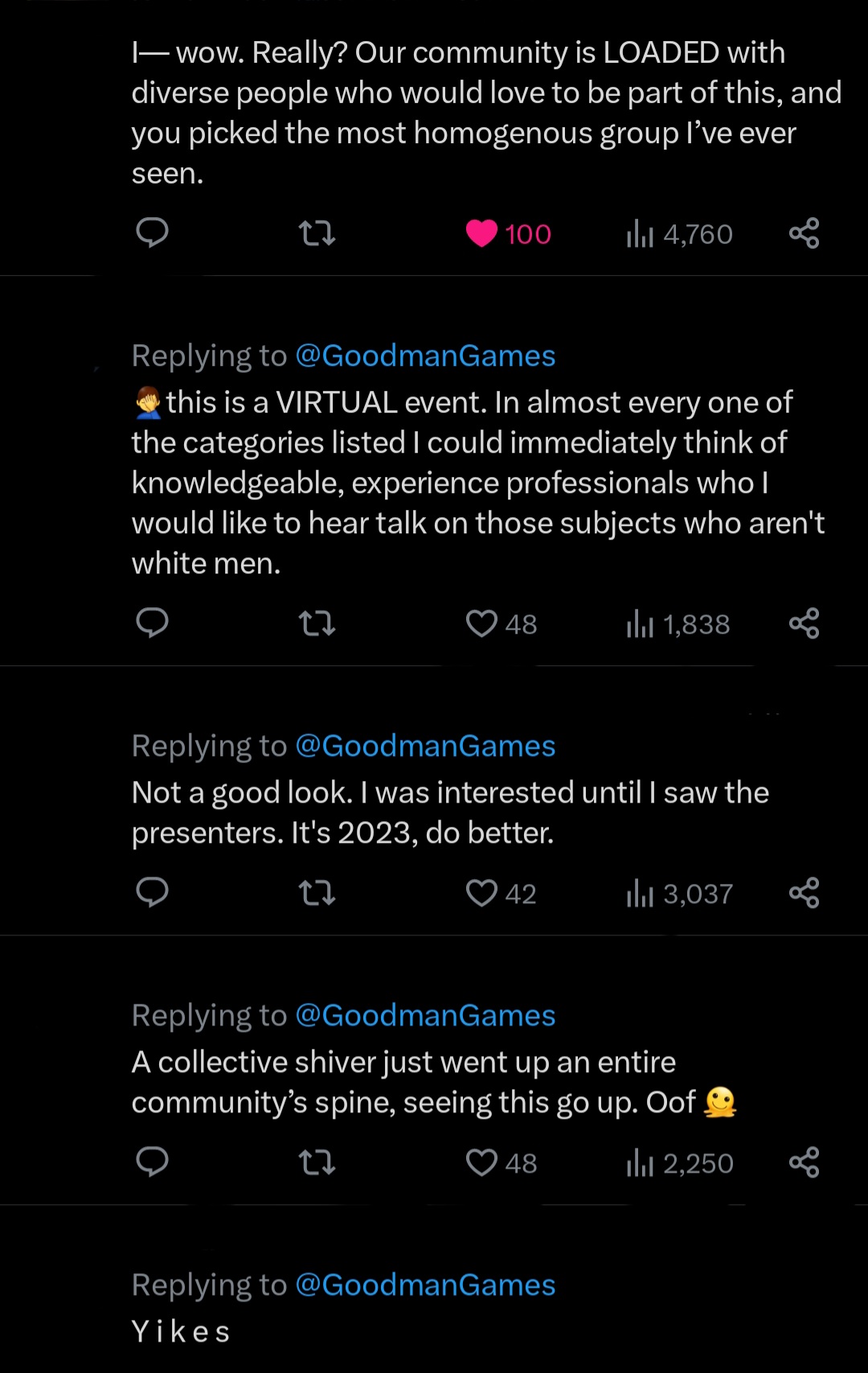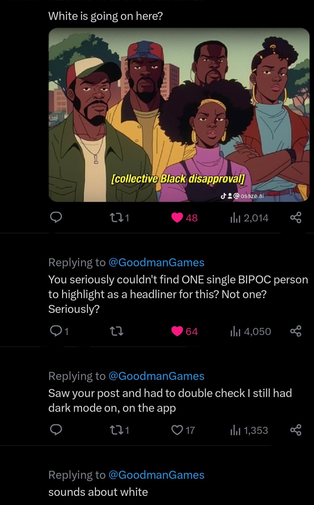 It’s 2023. People DEMAND to be represented and included in a fair and equal manner. If that doesn’t show at first glance, there will be repercussions. This is especially true on the Internet. It’s especially true on social media, namely X (Twitter.) We can do better all around.