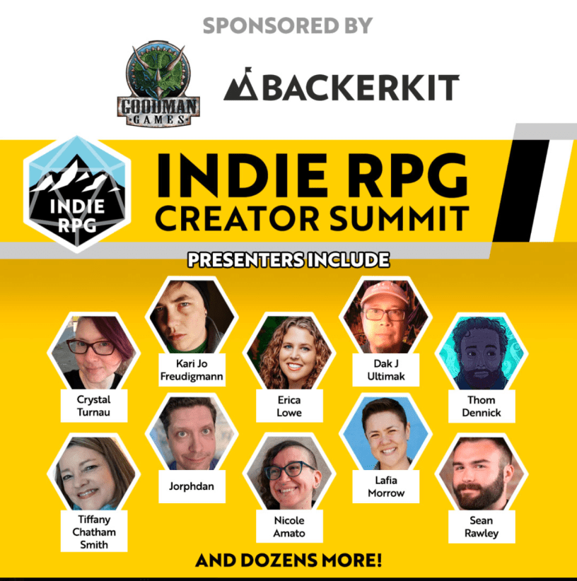 Despite the initial outcry over representation on social media in December of 2023, the Indie RPG Creator Summit went off without a hitch. (*Disclaimer: I didn’t get to attend every session.) The sessions I attended were very positive, offered good advice, and were very well organized. The presenters were knowledgeable, had great camera presence, and took care of most of the questions presented in the time they had. In many cases presenters even made themselves available for further questions after their presentation.