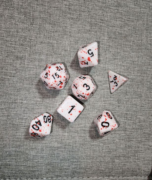 People have sent me blood-spatter patterned dice on more than one occasion at random. My favorite metal die was sent to me by Kylee The Dice Druid. (Link to her page here.) The color red in and of itself makes for stunning visuals and then to see them on dice is just cool.
