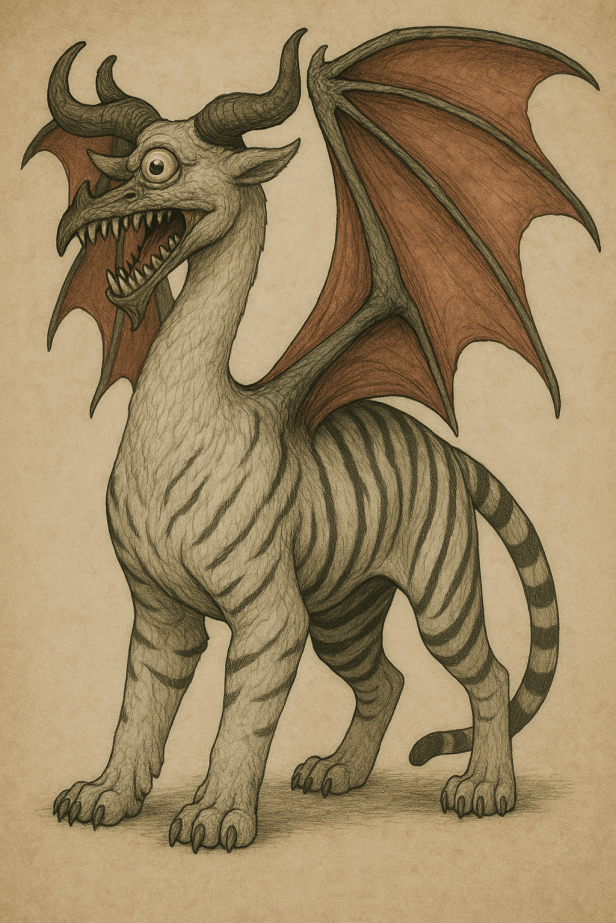 Description: Somehow this twisted monstrosity is in the dragon family. The top half was similar to that of a goose, with the bottom half that of a white tiger. The beak was full of razor sharp teeth, horns like a bull, and it had one menacing eye in the middle of its face. It certainly had the dragonly qualities of flight and breathing a lot of lightning. It was truly a sight to behold.