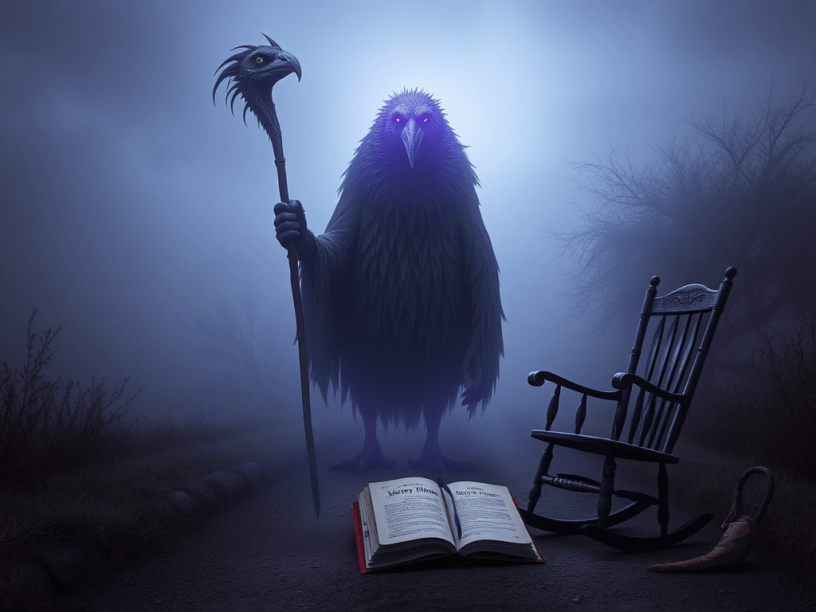 Sitting in it is a shriveled, humanoid-sized form of a goose in a black lace bonnet, gently rocking back and forth by unseen force. On its lap: a storybook titled “Cursery Rhymes”, opened to an ink-drenched page that reads itself aloud in a raspy voice. Next to the chair is a crooked shepherd’s crook thrust into the dirt, surrounded by a spiral of tiny, bare footprints.