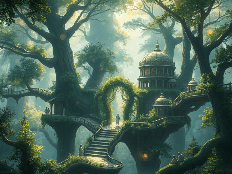 High in the canopy of the whispering Urthwilde stands Syvälehti, a sprawling network of elegant elven structures built into and around the trunks of towering glass-bark trees — pale-limbed giants with leaves that shimmer like windchimes. The elves of Syvälehti do not fell trees but grow their homes through guided druidic shaping, bending saplings with song and coaxing boughs into bridges and domes over generations.