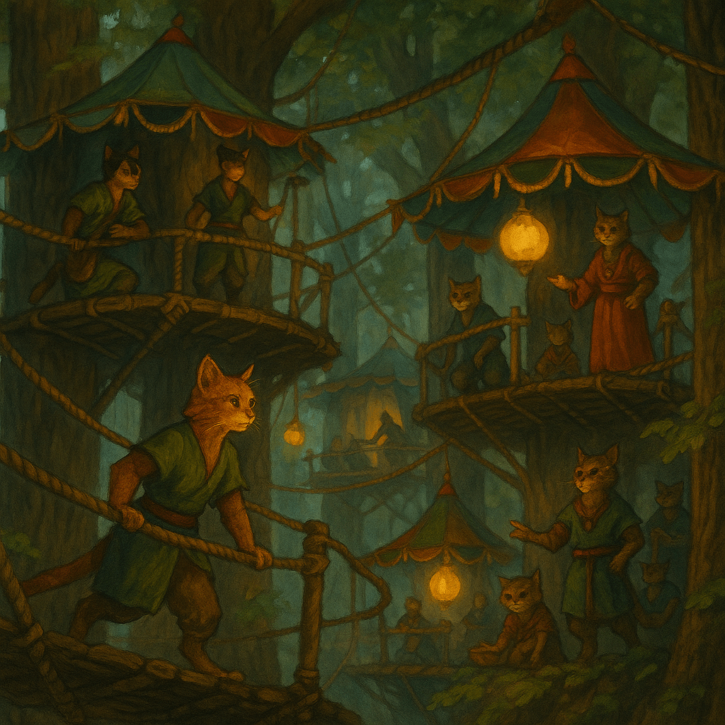 Purring with life, Nyano-Take is a vertical village nestled within a grove of thick-bamboo and flowering timber. Unlike the elves’ architectural harmony, the Cat Folk of Nyano-Take embrace playful chaos. Rope bridges swing between platforms with an almost mischievous layout. Homes are stitched with vine-silk and draped in colored fabrics that flutter in the wind.
