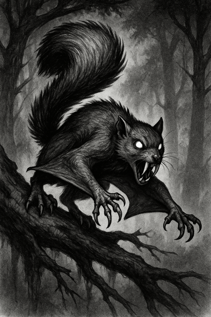 Screaming through the treetops in a blur of gray fur and blood-red eyes, the Chitterclaw is a gliding arboreal predator that moves like a streak of shadow. Its massive saber-like teeth and razor claws can rip through armor and flesh alike. It favors surprise attacks, leaping or gliding silently from above to rend its prey to ribbons before vanishing into the canopy once more.