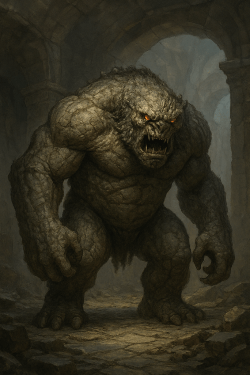 The Stonehide Jotun is a massive, troll-like humanoid said to be born from the mountains themselves. Its body is covered in slabs of rock-like skin, giving it the appearance of a living cairn. Unlike common trolls or ogres, it is semi-intelligent, enough to wield crude weapons or hurl boulders but still driven by hunger and territorial rage. Its booming roars echo through valleys and forests, striking fear into those who wander too close.