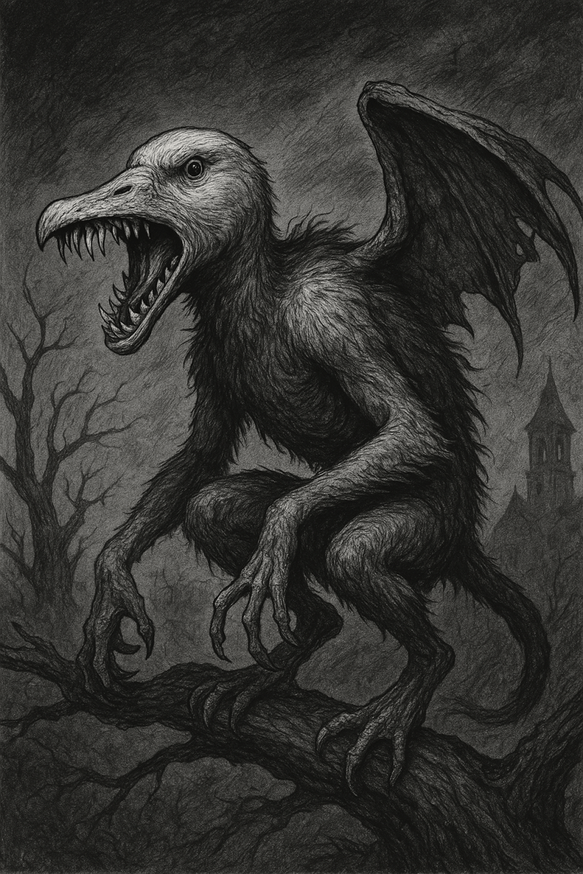 Howlgeese are unholy hybrids of monkey and goose, with grasping hands, greasy fur, and ragged wings too small to fly. Their faces are stretched with needle-like teeth, and their howls mix human-like shrieks with goose-honks that echo for kilometers. They lurk in trees or rafters, dropping on prey and ripping out clumps of hair, feathers, skin, and even teeth to line their nests or just to eat. Packs often fight each other as much as intruders, but hunger drives them into frenzied ambushes.