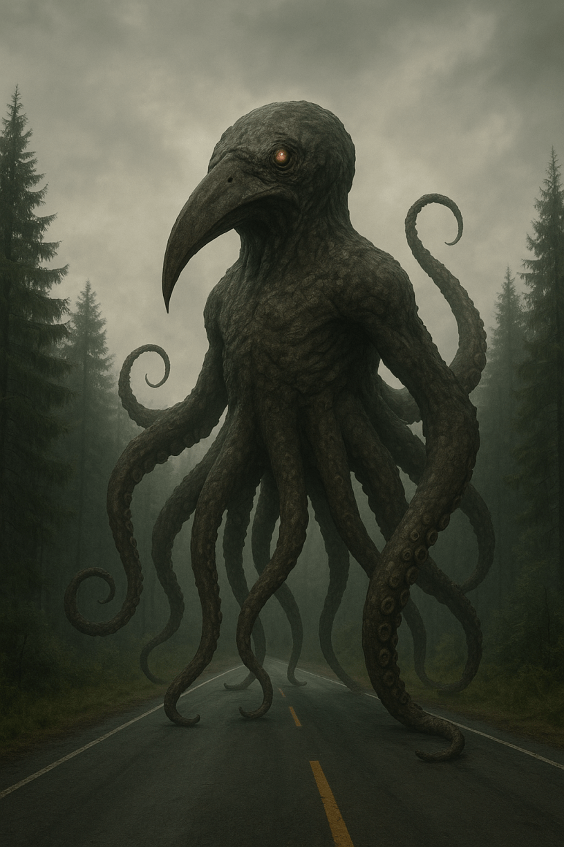 A towering nightmare that stalks the deep forests and lonely roads, this ten-tentacled abomination is whispered about in fearful tavern tales. It lumbers upright on four massive limbs, while the others lash and writhe around it. Its front-facing beak clicks and grinds, echoing through the fog. Some say it is not of this world, but something dragged here from an ocean that does not exist.