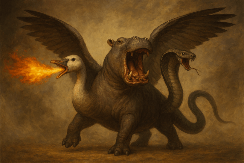 The Serpent Goose Chimera is a failed experiment in divine cruelty or draconic whimsy. Its leonine body supports three competing minds that can never agree on which prey to kill first. The cobra hisses threats and sprays venom, the hippopotamus bellows and bites anything nearby, and the goose screams fire and obscenities in equal measure. Together, they are noise and nightmare incarnate.
