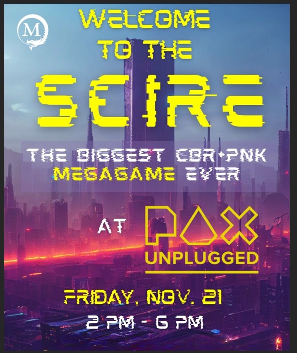 Okay, what is it? CBR+PNK +Weird RPG is a cyberpunk style game that uses a streamlined version of the CBR+PNK system. In this case players will be divided into eight different crews in eight different zones with eight separate GMs each with their own unique mission within the SCIRE (Self Contained Industrial Residential Environment.) The SCIRE has recently experienced a mysterious Event causing the arcology to go on lockdown (before the convention started.) Over 60 players, split across eight zones, play out the crisis in real time as residents, crews, and rival corporations all try to understand and influence what is happening inside the SCIRE.