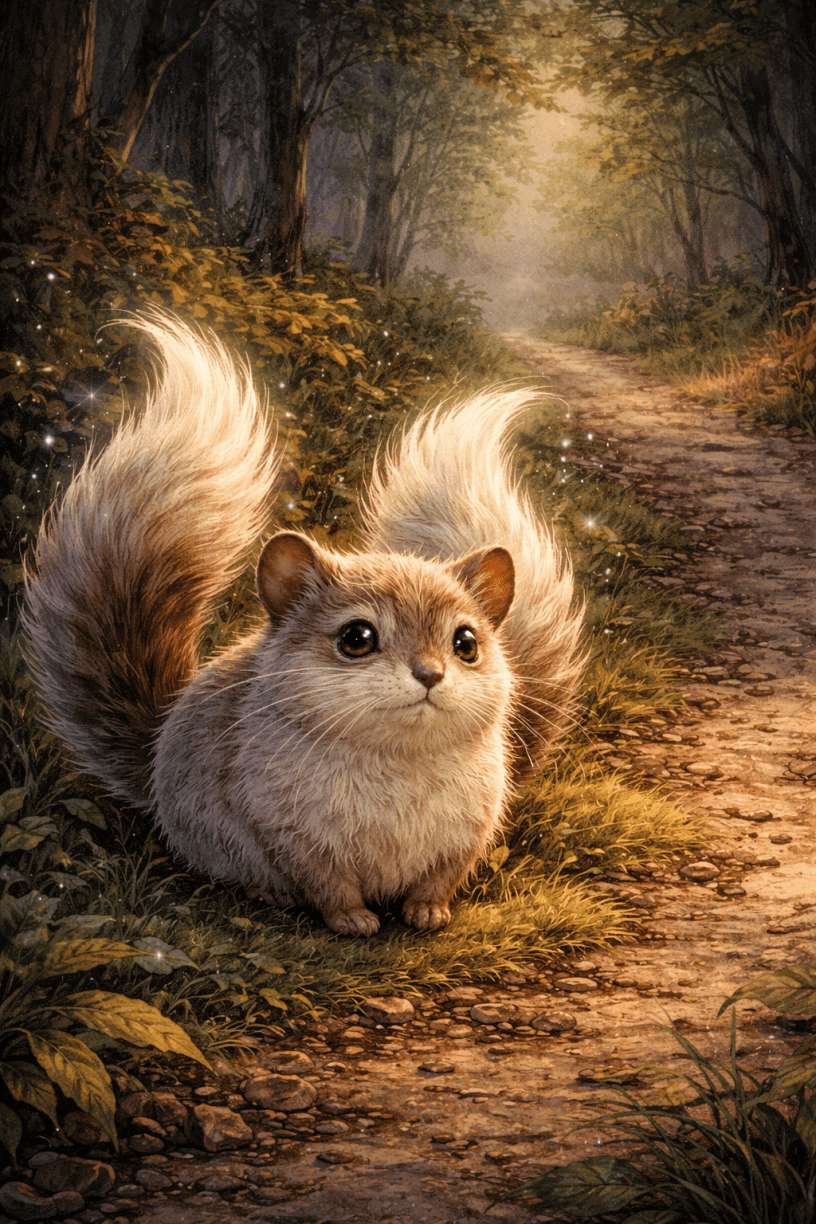 The Lemmikyn is a small, four-legged animal resembling a plump mountain lemming with unusually large, watchful eyes. Its most striking feature is its two foxlike tails, each tipped with pale silver fur that faintly glimmers in low light. Its coat shifts subtly with the weather, dusty gray before storms, off-white in snow, and tawny in autumn forests, making it easy to overlook at first. When startled, both tails flick in opposite directions, as if reacting to different futures. It moves with quick, nervous hops, often stopping to sniff the air or stare intently at nothing at all.