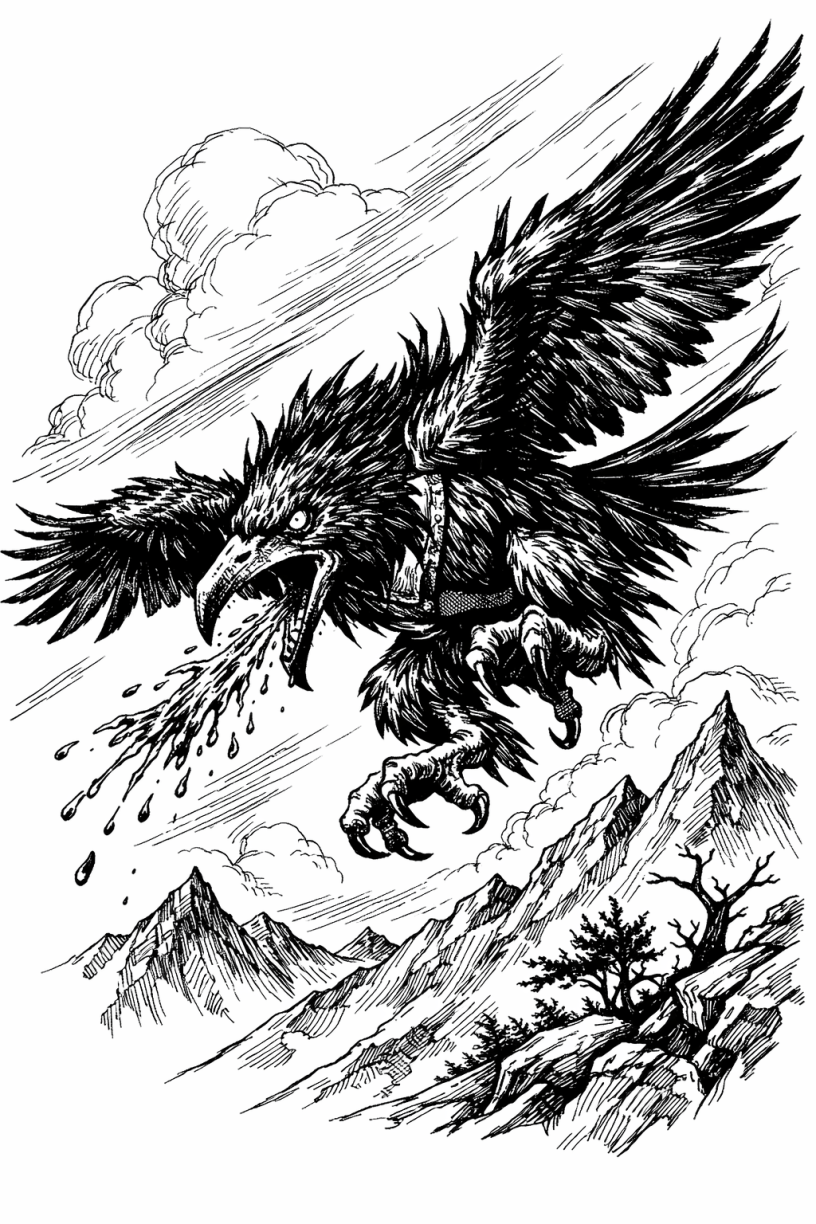 Venomous Tengu are anthropomorphic ravens with slick black feathers, hooked beaks, and sharp talons. They lurk in high places and strike with cruel intelligence, spitting toxic venom before closing in to finish weakened prey. Their voices are harsh, mocking, and often echo with unsettling laughter.