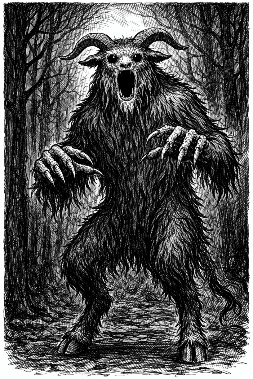 A towering, hairy humanoid with the head of a black-eyed goat. Its almond-shaped eyes are glossy and depthless, reflecting no light. The mouth hangs too wide, too slack, as if unhinged. Its fingers are long and rake-like, ending in splintered claws. It smells of damp earth, rot, and wet fur. It does not speak, but sometimes it laughs.